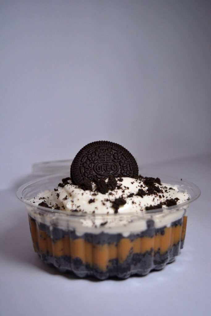 Capas suaves de crema dulce y galletas Oreo que se funden en cada bocado. Un equilibrio perfecto entre crocante y cremoso, coronado con trocitos de chocolate y una Oreo entera para hacerlo irresistible.
