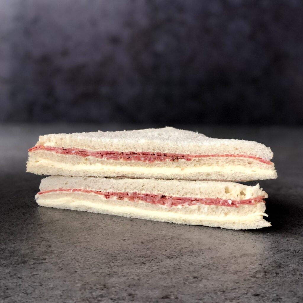 Capas finas de pan de miga, rellenas con fetas de salame y queso fundente, unidas por una suave lactonesa que realza cada sabor. Una combinación clásica y sabrosa, ideal para los que disfrutan un toque intenso y cremoso en cada bocado.
